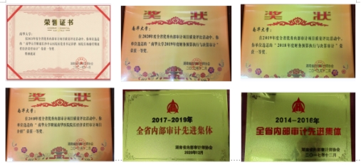 近年来,审计处多次获得省、市表彰。2021年获湖南省教育厅审计优秀单位,2014年至2020年获湖南省、衡阳市内部审计先进集体,2018年至2021年连续四年获全省优秀审计项目一等奖……这些表彰和奖励凝聚的是南华审计人的心血和汗水,体现的是南华审计人的责任和担当,更彰显着南华审计人对审计工作的执着和坚守。
